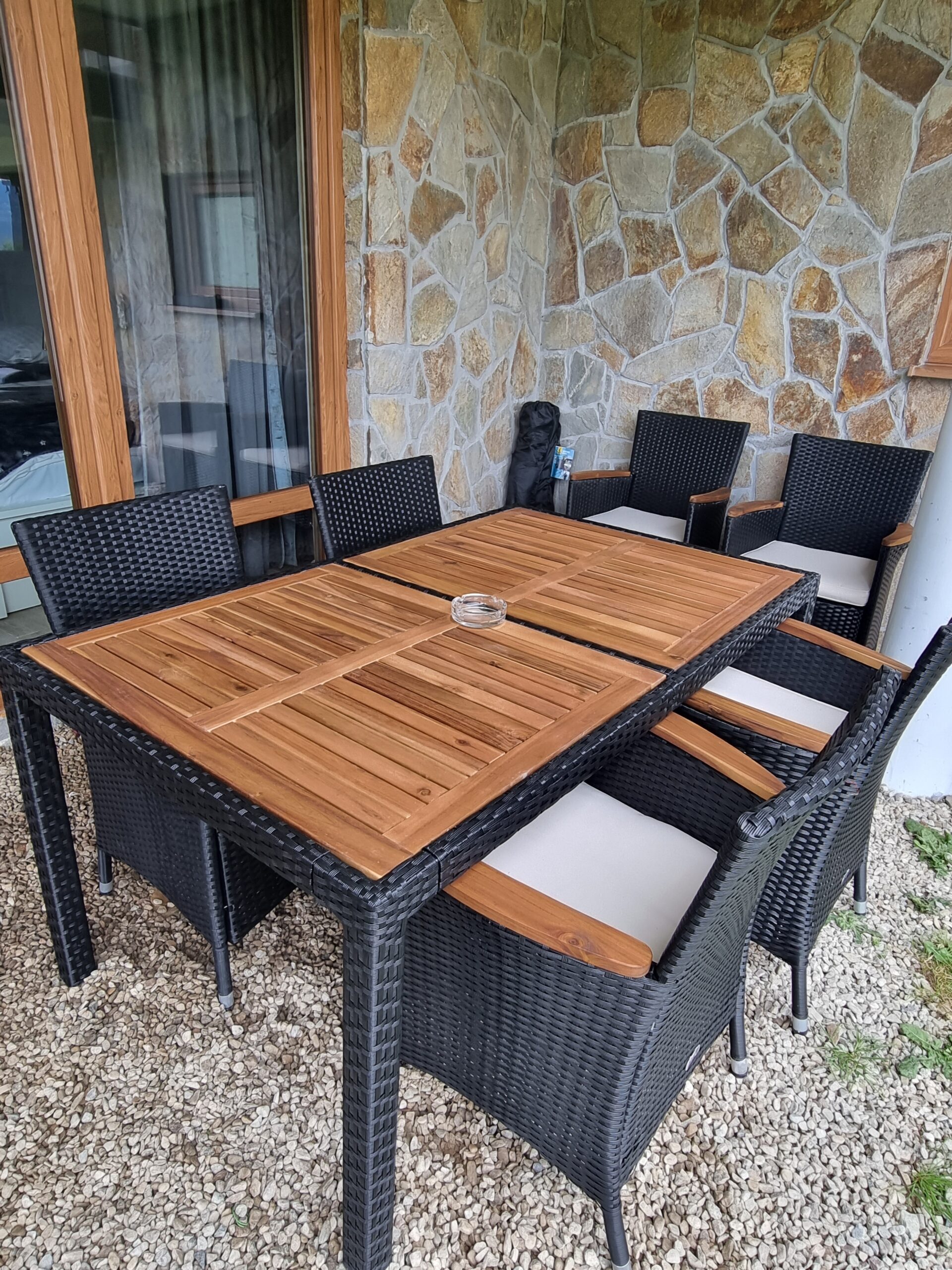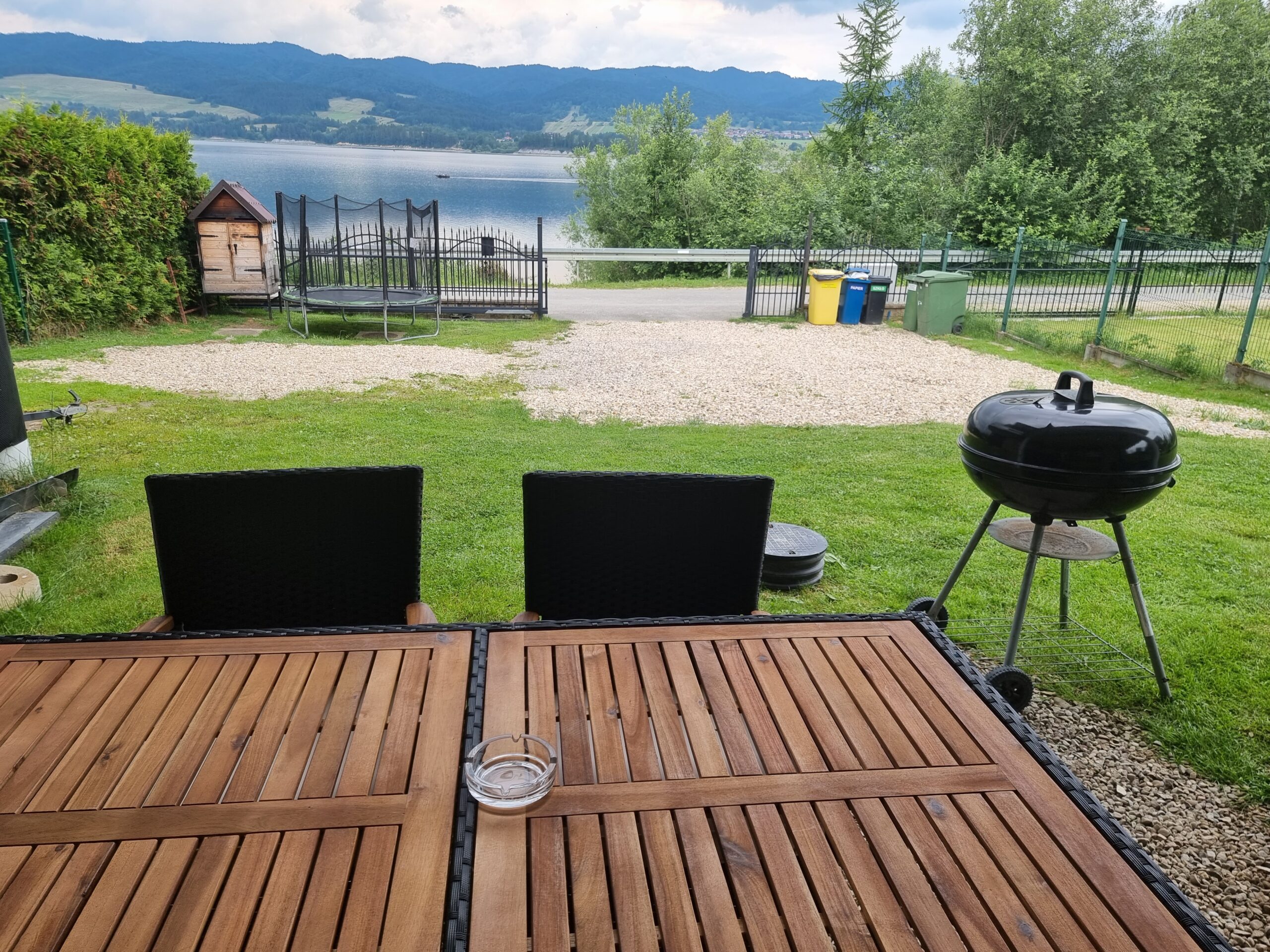Przed apartamentem jest wyjście na taras ziemny ,z którego roztacza się piękna panorama na jezioro Czorsztyńske. Można tu odpocząć relaksując sie przy wspólnym grillu.