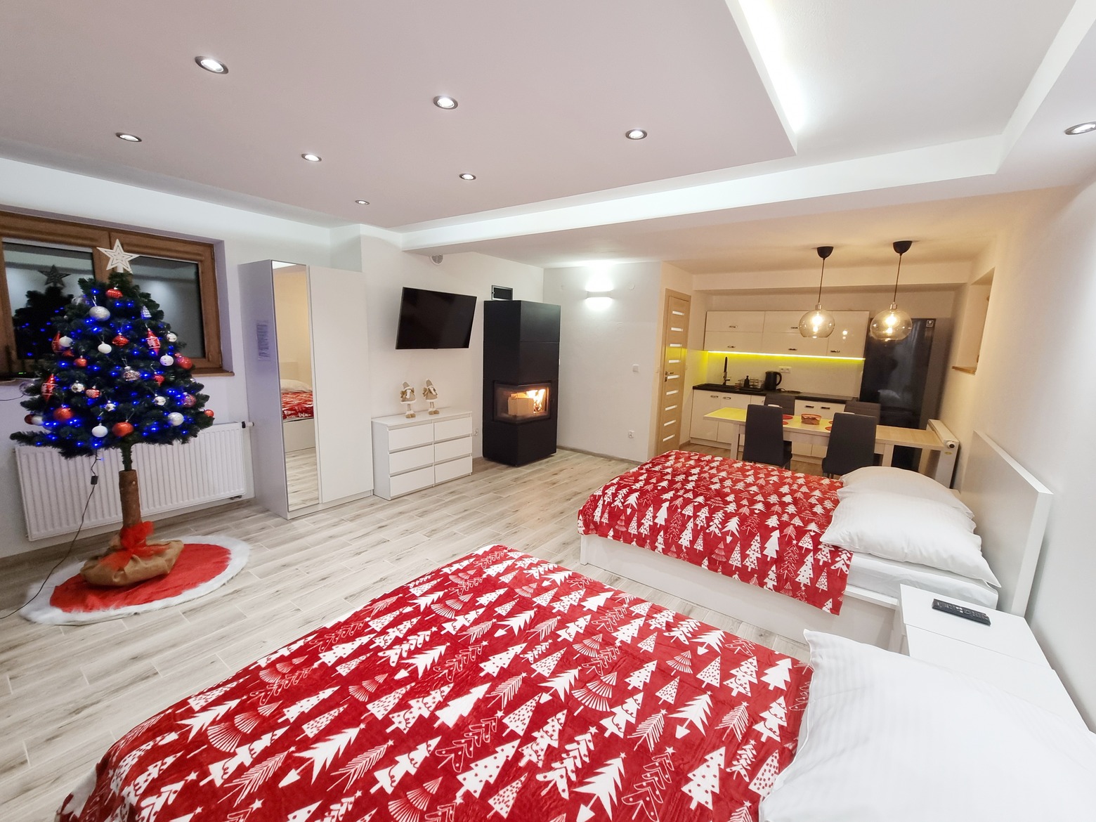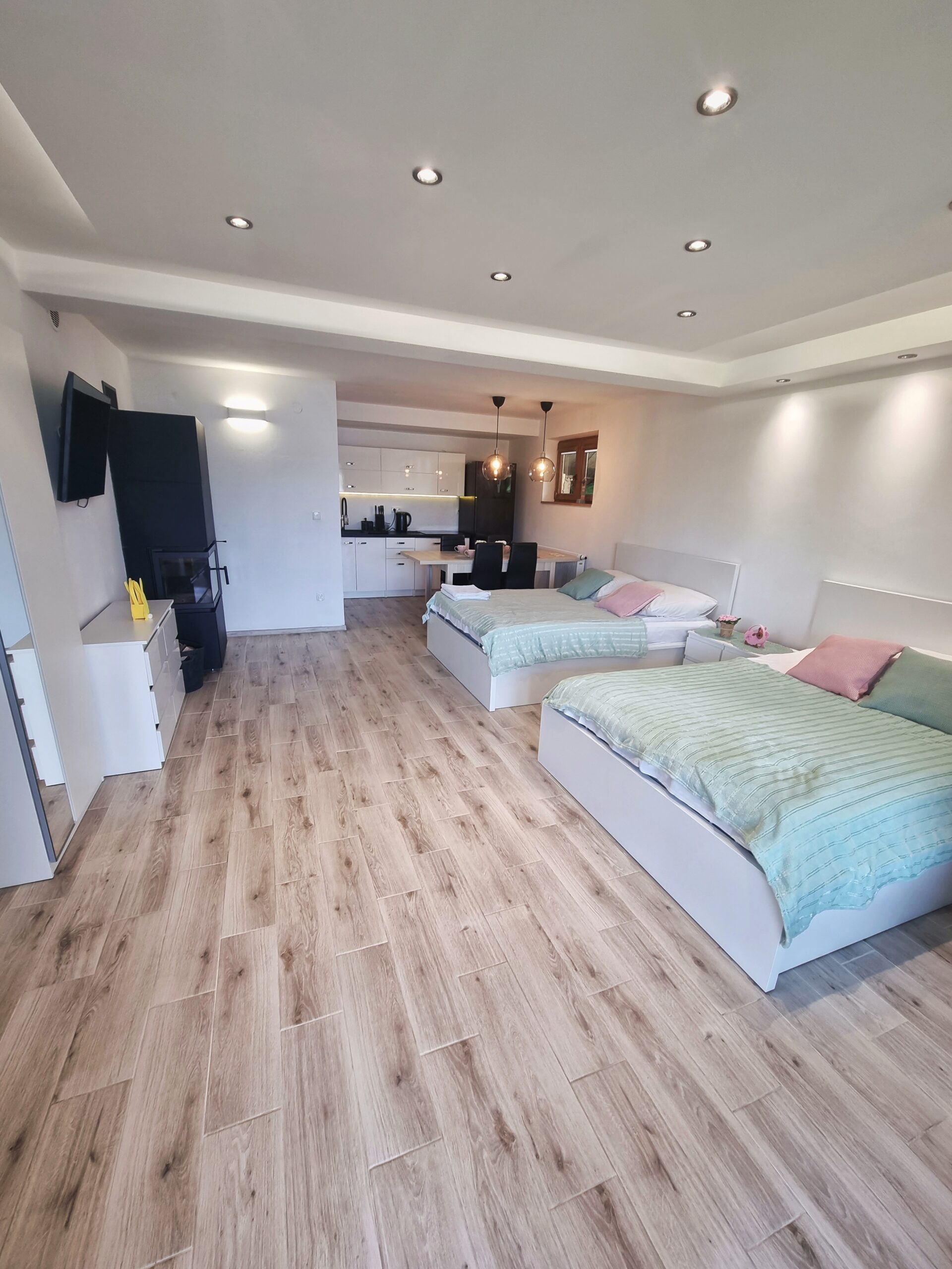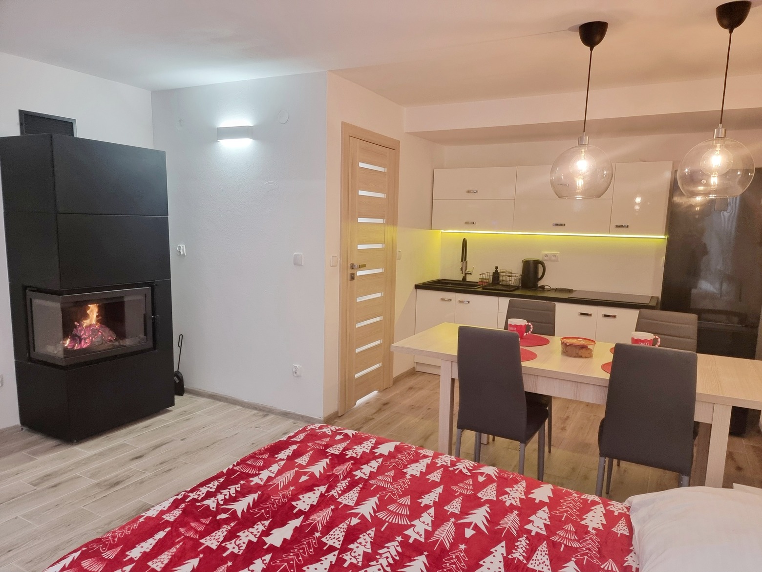 Apartament znajduje się na parterze domku z niezależnym wejściem od frontu budynku. To przestronny salon z kominkiem, aneksem kuchennym i łazienką. W aneksie kuchennym jest wszystko co niezbędne do przygotowania I serwowania posiłków. W skład wyposażenia wchodzą:lodówka z zamrażalką, płyta indukcyjna 4 palnikowa, czajnik, naczynia oraz komplet sztućców i garnków.