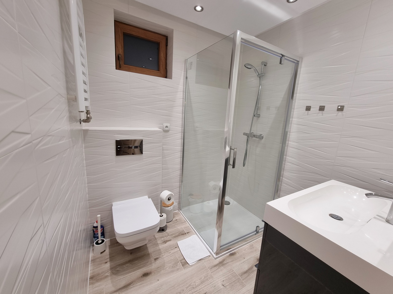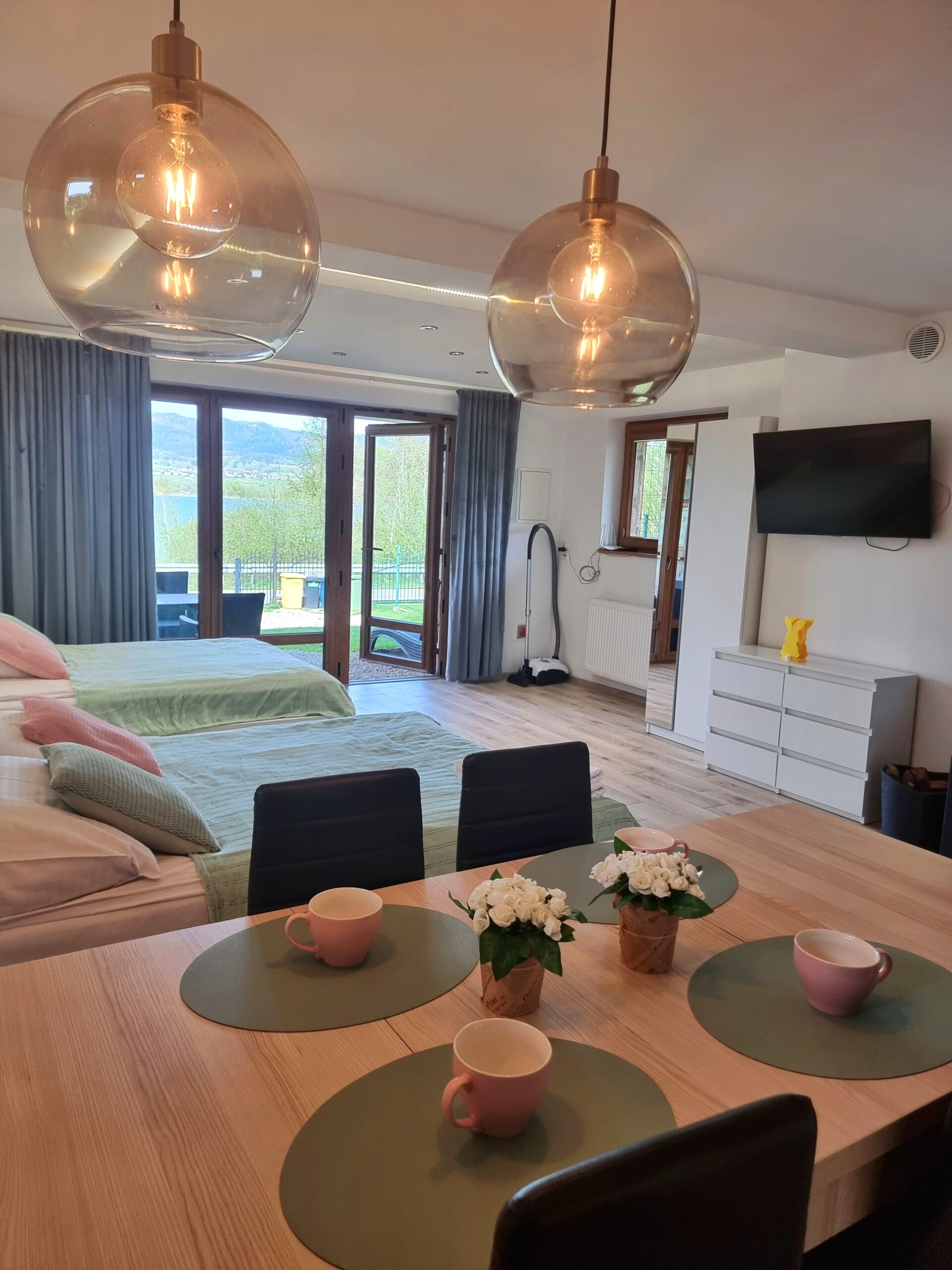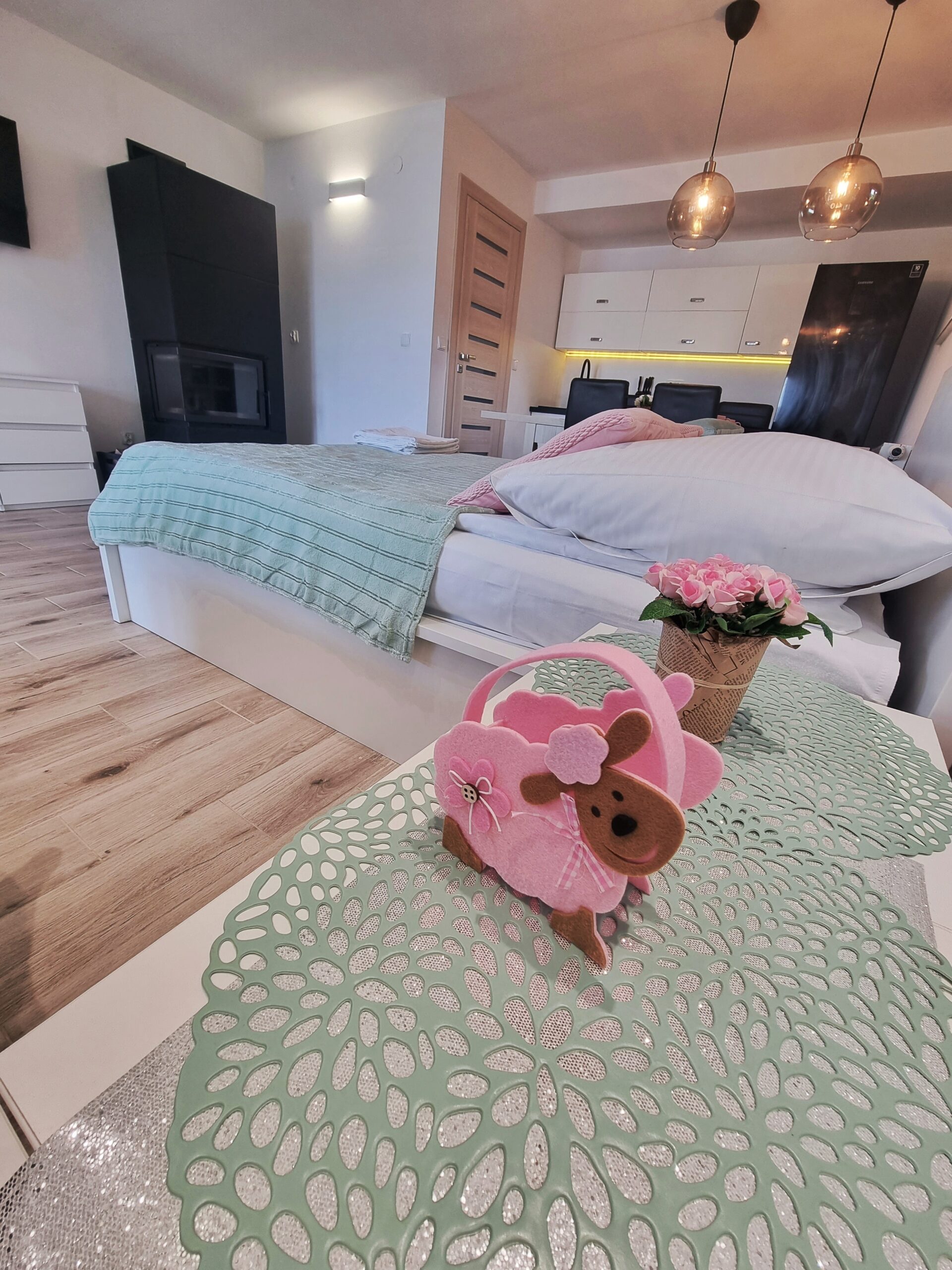 Apartament znajduje się na parterze domku z niezależnym wejściem od frontu budynku. To przestronny salon z kominkiem, aneksem kuchennym i łazienką. W aneksie kuchennym jest wszystko co niezbędne do przygotowania I serwowania posiłków. W skład wyposażenia wchodzą:lodówka z zamrażalką, płyta indukcyjna 4 palnikowa, czajnik, naczynia oraz komplet sztućców i garnków.